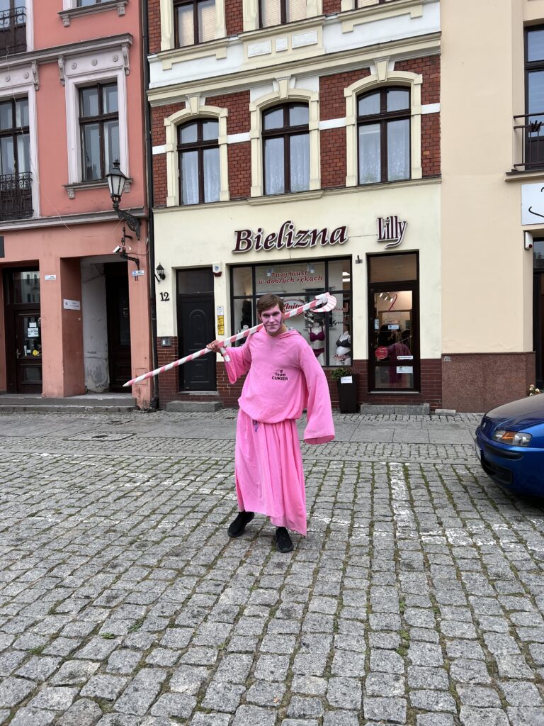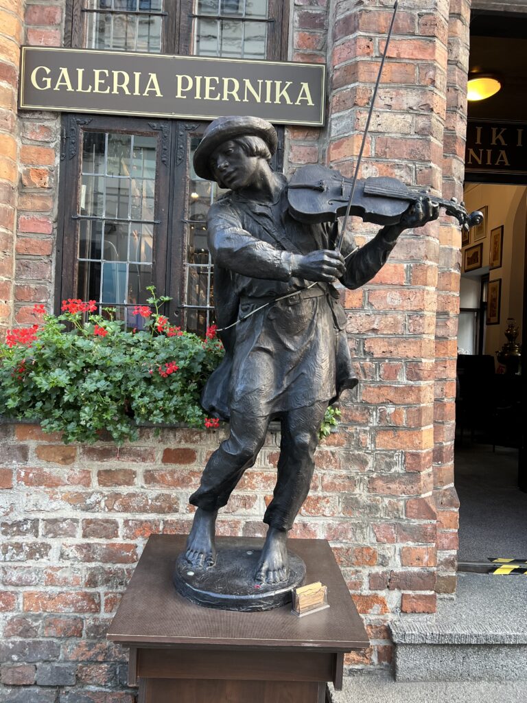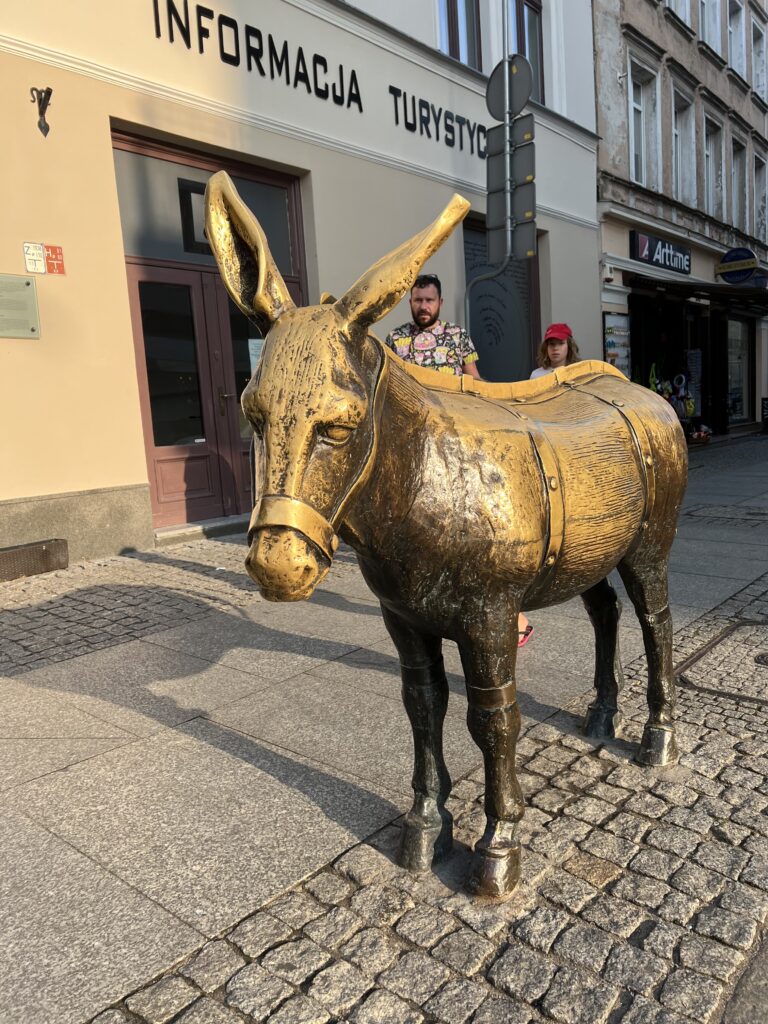 Kitame Rotušės aikštės kampe mūsų laukia šuo Filusas su skrybėle dantyse ir skėčiu iš populiarių lenkų komiksų. Prie jo nusifotografuojame kaip ir visi kiti turistai. Filusas yra nedidelis, tenka žemai lenktis, kad jį pasiektum.