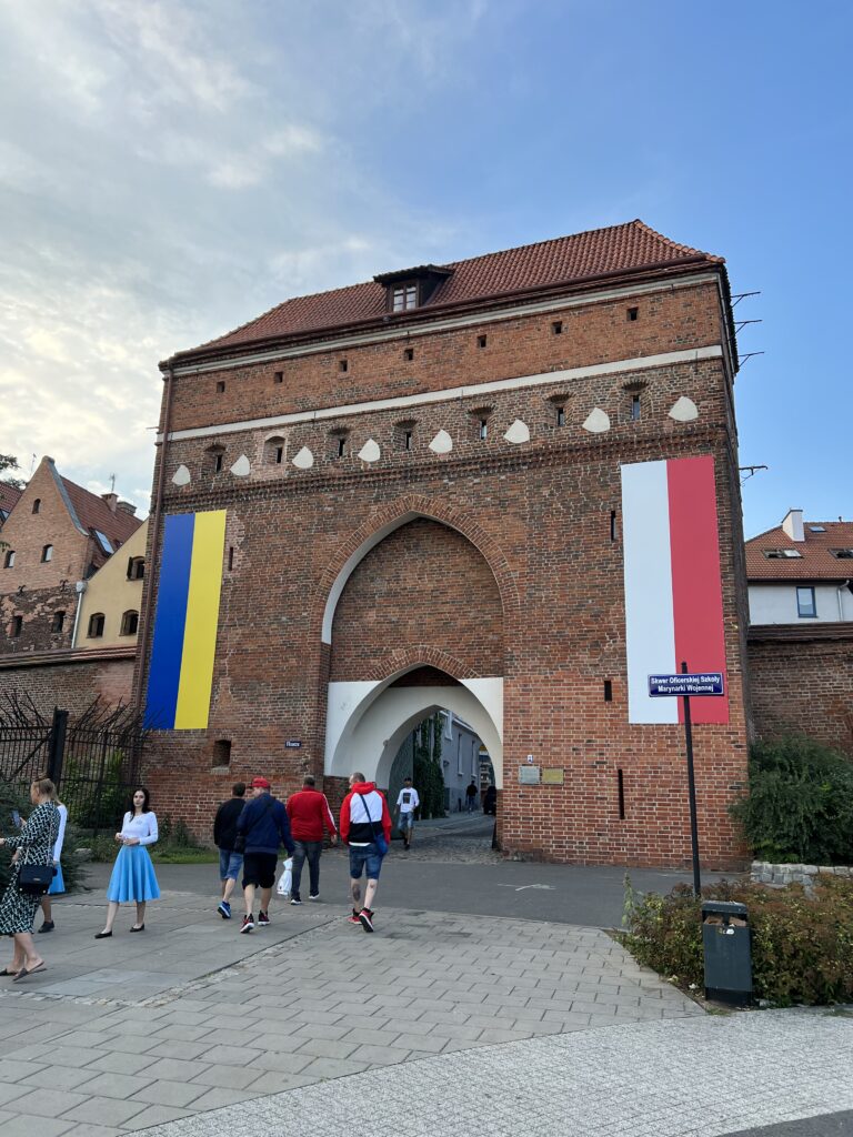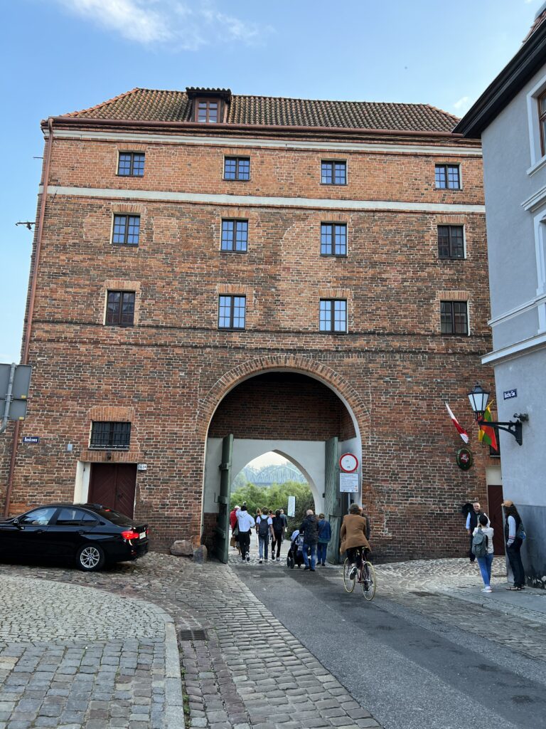 Pasukame į kairę, į Šv. Dvasios gatvę. Ji baigiasi prie miesto vartų. Pro juos matosi pakopomis takas veda į Vyslos pakrantę. Vartai gražūs aukšti gotikiniai. Prie pat vartų kabo Lietuvos vėliava, yra Lietuvos konsulatas. Atiduodame pagarbą tėvynei, nusifotografuojame.