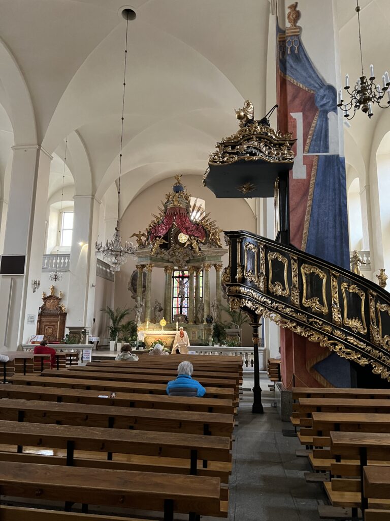 Pasukus atgal kita gatve sugrįžtame prie Šv. Dvasios barokinės bažnyčios. Ją apžiūrime iš vidaus. Tai jėzuitų bažnyčia netoli senamiesčio rotušės.