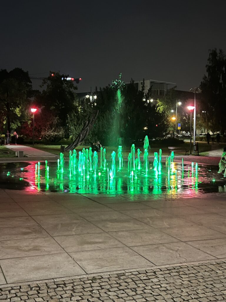 Už šių pastatų yra daug žalios erdvės. Joje yra šviesos- muzikiniai fontanai. Sutemus gėrimės vaizdais ir muzika.