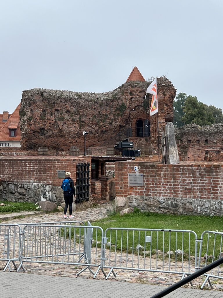 Dar arčiau Vyslos yra Kryžiuočių pilies griuvėsiai pasagos formos. Jie matomi iš tolo, yra pasagos formos. Pilies geriausiai išlikusi dalis yra danskeris sujungtas su pilimi koridoriumi. Tai viduramžių tualetas. Griuvėsių lankymas yra mokamas, viduramžių tualetų mes jau matėm, apsieisim pažiūrėję iš toliau. Torunės pilis buvo Kryžiuočių Ordino sostinė iki Malborko pilies atsiradimo.